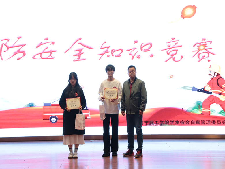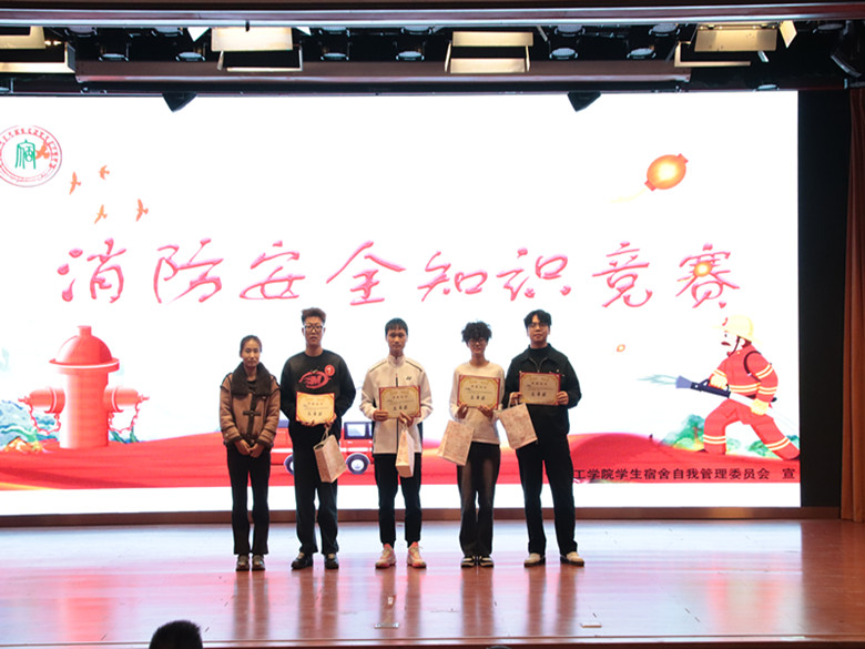 为深入推进消防安全宣传教育,切实增强广大师生的消防安全意识与自救互救能力,12月3日,由后勤保卫处主办,学生宿舍自我管理委员会(简称宿管委)承办的“关注消防,平安校园”消防安全知识竞赛决赛暨颁奖典礼活动在1626报告厅举行。后勤保卫处处长钟木生、公寓中心全体行政人员以及宿管委全体成员参加。 自启动以来,竞赛得到了全校学生的积极响应和广泛参与。经过初赛、复赛的选拔,共有7位选手脱颖而出,晋级决赛。决赛现场,选手们不仅展现了自己的消防知识积累,还进一步加深了同学们对消防安全的认识和理解。 经过激烈角逐,米焕然同学荣获一等奖,王紫涵、张聪获得二等奖,张志豪、邓家宝、袁志华、郑旭阳同学获得三等奖。 获得一等奖同学 获得二等奖同学 获得三等奖同学 活动最后,后勤保卫处处长钟木生做总结讲话。他向获奖同学表示祝贺,并希望全体同学:一要持续增强消防安全意识,将“预防为主”内化于心;二要主动参与各类消防安全活动,提升自救互救能力;三要全面强化综合安全素养,筑牢校园安全防线。 本次竞赛以赛促学,有效普及了消防安全知识,营造了“人人关心安全、人人参与安全”的浓厚氛围。后勤保卫处将以此次活动为新的起点,发挥获奖同学的榜样作用,带动更多同学关注消防、学习消防、参与消防,共同守护平安校园。